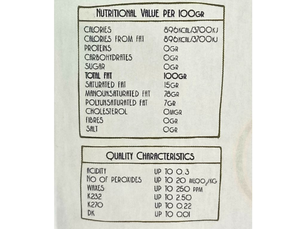 Fénytől védett 500 ml sötétzöld marasca típusú üvegbe van palackozva, mely megőrzi aromáját és védi a napfény oxidáló hatásaitól, így az olaj tovább tartja természetes antioxidánsait és tápanyagait.